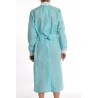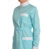 Découvrez notre blouse modèle Anaïs en nylon turquoise. Cette blouse en nylon est très féminine avec ses empiècements contrastés blancs et sa ceinture à nouer pour un effet blousant !
