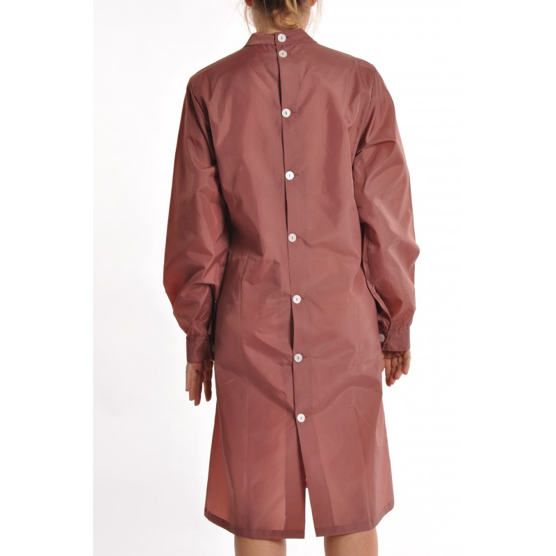 Découvrez toute notre gamme de blouses nylon ! Gros succès pour cette Blouse Emeraude en nylon bordeaux , son boutonnage dos et sa grande longueur !