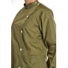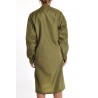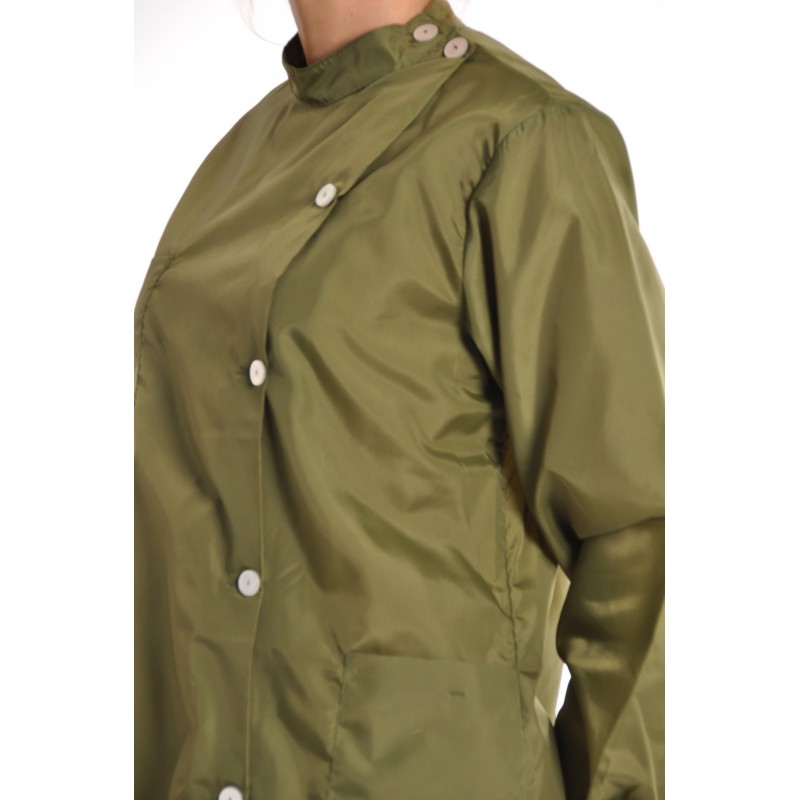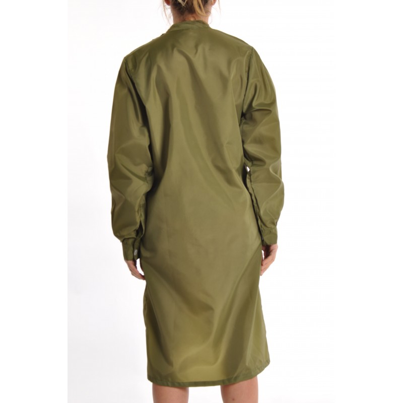 Découvrez toute notre gamme de blouses nylon ! Vous serez séduit par cette Blouse Rubis en nylon kaki, son boutonnage décentré et sa grande longueur !