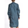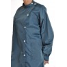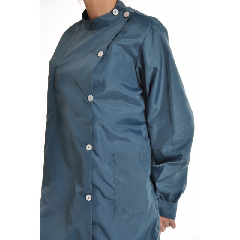 Découvrez toute notre gamme de blouses nylon ! Vous serez séduit par cette Blouse Rubis en nylon bleu canard, son boutonnage décentré et sa grande longueur !
