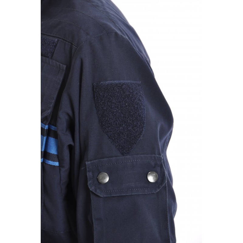 - 2 poches manches de 3 soufflets avec un rabat, fermées par un velcro et 2 boutons pressions décoratifs
