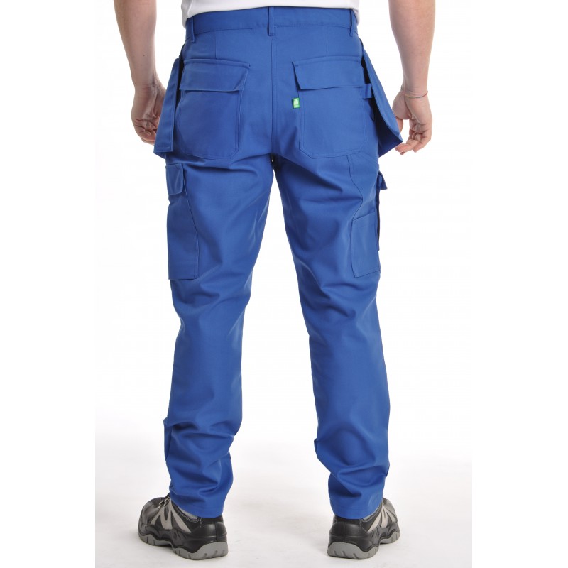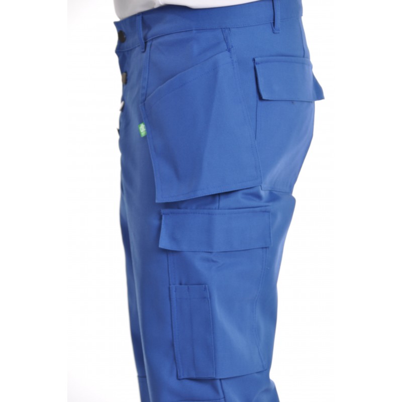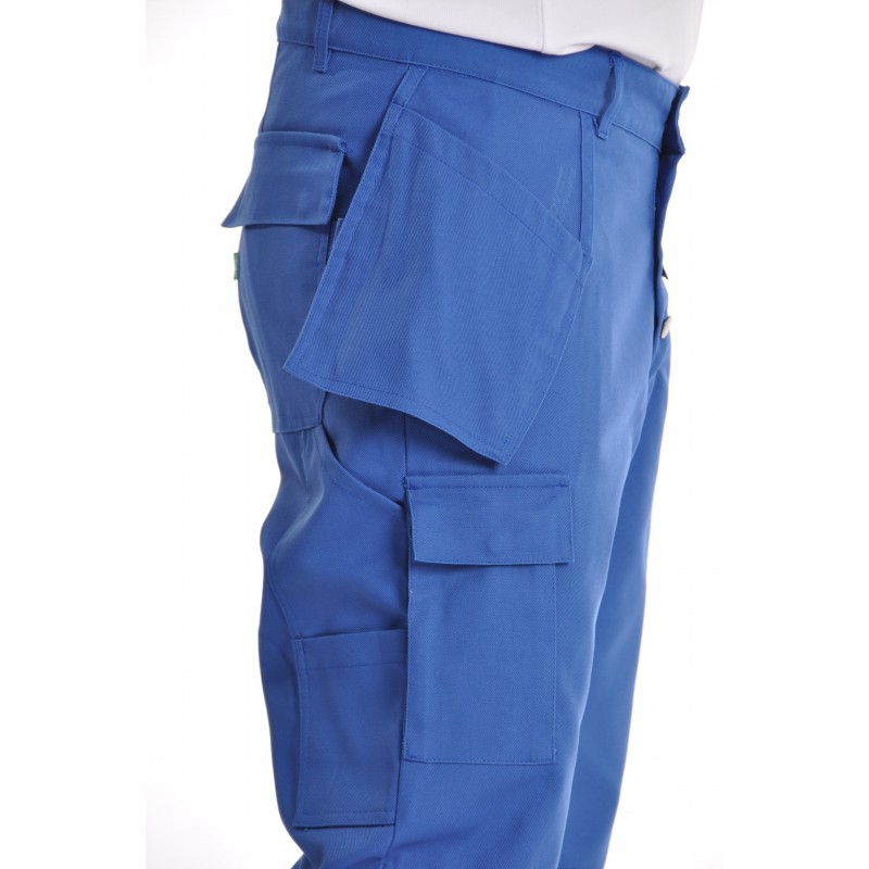 Ce pantalon de travail multipoches bleu bugatti assure confort et praticité grâce à ses nombreuses poches.