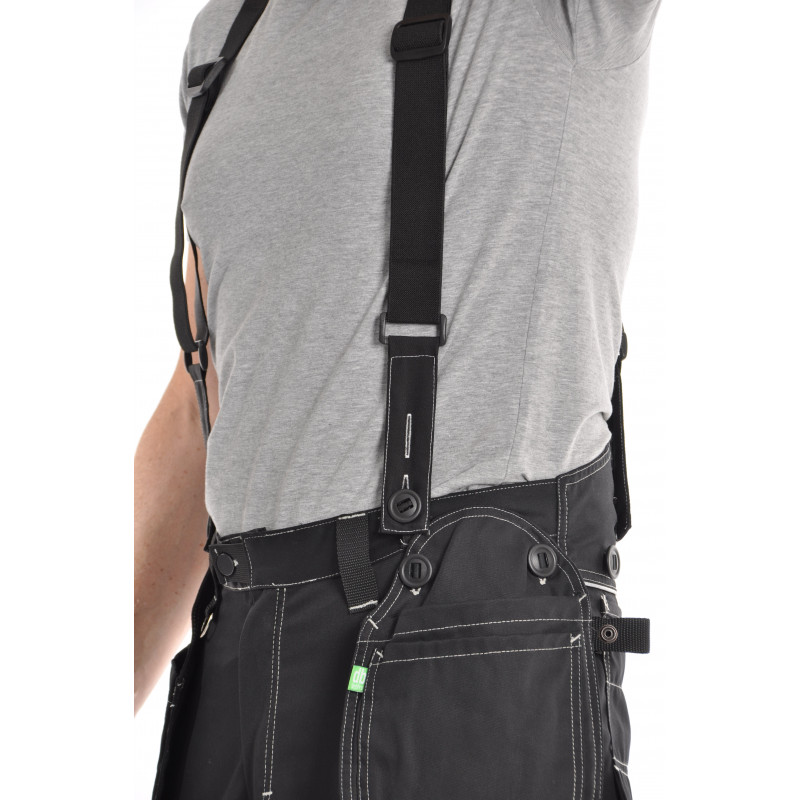Ce pantalon de travail avec bretelles est également disponible avec des genouillères fixes.